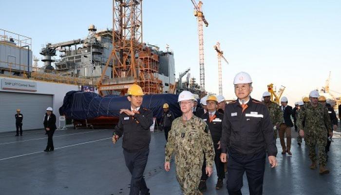 ▲ 한화오션을 방문한 대릴 커들(Darly Caudle, 왼쪽 두번째) 미국 해군참모총장과 한화오션 김희철 대표이사(왼쪽 세번째)가 한...
