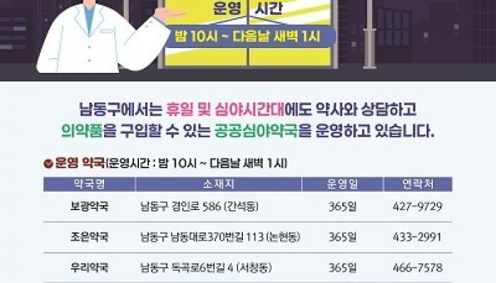 인천시 남동구가 심야시간대 의약품 구입 불편을 해소하고, 안전하고 편리한 공공보건의료 서비스를 제공하기 위해 ‘공공심야약국’을 운영한다. 공공심...