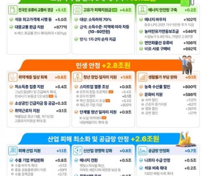 정부가 중동전쟁 위기 극복을 위해 26조 2000억 원 규모의 올해 추가경정예산안을 마련했다. 이번 추경은 유류비 지원 등을 ...