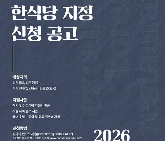 농림축산식품부(장관 송미령)와 한식진흥원(이사장 이규민)이 한식의 품질 향상과 소비자 보호를 위한 ‘2026년도 해외 우수 한식당 지정 사업’ ...