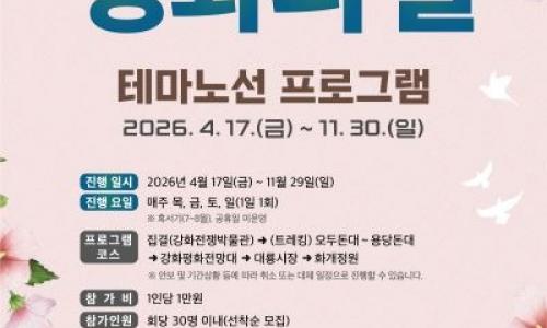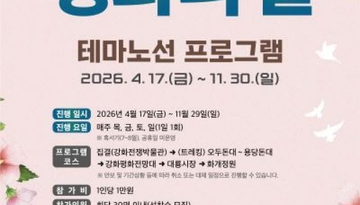 강화군은 오는 4월 17일부터 11월 30일까지 비무장지대(DMZ) 인근을 따라 조성된 ‘DMZ 평화의 길 테마 노선’ 프로그램을 본격적으로 운...