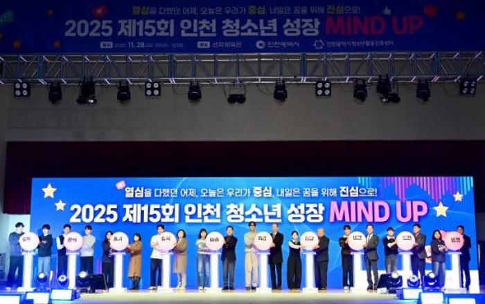 ▲ 유정복 시장이 28일 선학체육관에서 열린 '2025 제15회 인천 청소년 성장 MIND UP' 행사에서 사회진출 응원 퍼포먼스를 하고 있다.인천시가 미래 사회 지출을 앞둔 고등학교 3학년 청소년들의 꿈과 도전을 응원하는 뜻깊은 자리를 마련했다.지난 11월
