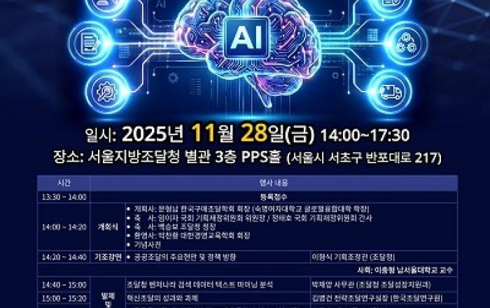 한국구매조달학회(회장 문형남, 숙명여자대학교 글로벌융합대학 학장)는 대한경영교육학회(회장 박찬황) 및 한국조달연구원(원장 이상윤)과 함께 오는 11월 28일(금) 서울지방조달청 별관 3층 PPS홀에서 ‘AI 시대, 구매조달 법·제도·기술의 혁신 방향’을 주제로 2025