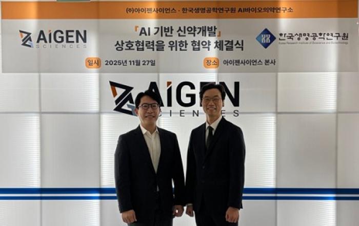 ▲ 왼쪽부터 아이젠사이언스 강재우 대표, 한국생명공학연구원 AI바이오의약연구소 지승욱 소장AI 기반 신약 개발 기업 아이젠사이언스(대표 강재우)와 한국생명공학연구원 AI바이오의약연구소(소장 지승욱)가 지난달 27일 서울 아이젠사이언스 본사에서 AI 신약 개발