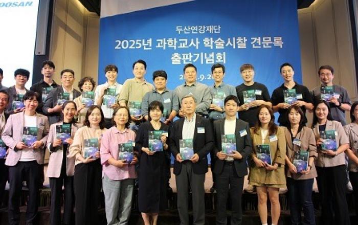 ▲ 박용현 두산연강재단 이사장(첫째 줄 왼쪽 일곱 번째)이 과학교사 학술시찰 견문록의 출간을 축하하며 교사들과 함께 기념촬영을 하고 있다.두산연강재단은 26일 앰배서더 서울 풀만 호텔에서 과학교사 학술시찰 견문록 발간을 기념하는 출판기념회를 열었다고 28일 밝혔다.올해