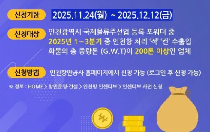 인천시시와 인천항만공사는 인천지역 물류업계 지원을 통한 인천항 물동량 증대를 위해 ‘2025년도 인천시 포워더* 인센티브’ 지원기업을 내달 12일까지 모집한다고 23일 밝혔다.2020년 시작한 ‘인천시 포워더 인센티브’는 지난해까지 248개 기업에 누적 6억 2,600