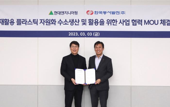 현대엔지니어링이 한국동서발전과 ‘재활용 플라스틱 자원화 통한 수소생산 및 수소 활용 연계사업 협력’을 위한 MOU를 체결했다고 3일(금) 밝혔다. 이날 현대엔지니어링 본사에서 진행된 업무협약식에는 홍현성 현대엔지니어링 대표이사, 김영문 한