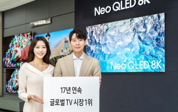 삼성전자 모델이 경기 용인시에 위치한 삼성 디지털프라자 수원본점에서 17년 연속 글로벌 TV 시장 1위를 달성한 삼성전자의 TV 제품들을 선보이고 있다.삼성전자가 2006 년부터 작년까지 17 년 연속 글로벌 TV 시장 1