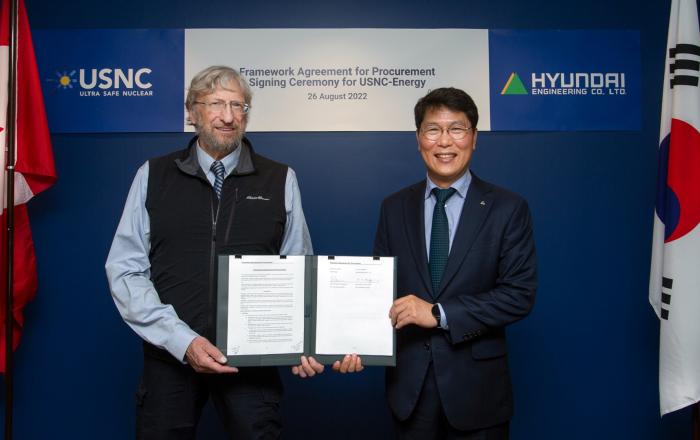 현대엔지니어링이 「4세대 초고온가스로 소형모듈원전」 전문 기업인 미국의 USNC社와 MMR(Micro Modular Reactor, 초소형모듈원전) 분야 글로벌 선두주자 입지 굳히기에 나섰다.현대엔지니어링은 지난 26일 「캐나다 초크리버 MMR 실증사업」과 관련해 주요