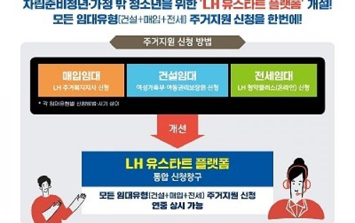 한국토지주택공사(LH)는 국토교통부, 보건복지부, 여성가족부와 손잡고 자립준비청년과 가정 밖 청소년을 위한 ‘유스타트(Youth+Start)' 3.0 종합지원 방안을 추진한다고 밝혔다.‘유스타트(Youth+Start) 프로그램'은 사회에 첫발을 내딛는 청년들의 안정적인
