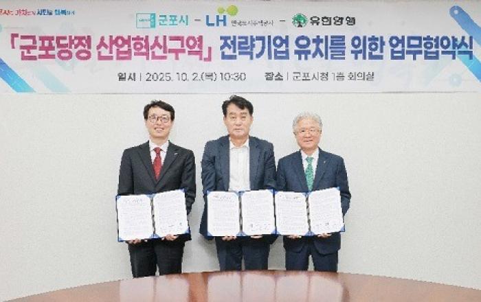 한국토지주택공사(LH)는 2일 군포시청에서 ㈜유한양행, 군포시와 군포당정 산업혁신구역 활성화를 위한 전략기업 유치 업무협약을 체결했다고 밝혔다.이번 협약은 군포당정 산업혁신구역 내 주요 앵커기업을 유치, 바이오 R&D 혁신 생태계를 조성함으로써 혁신구역의 자족기