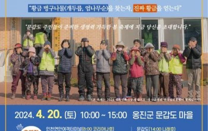 옹진군은 오는 4월 20일(토), 덕적면 소재 문갑도에서 벙구나물 축제가 열린다고 밝혔다. 벙구나물은 개두릅, 엄나무순을 칭하는 말로 4월 초중순 10일 정도만 수확할 수 있는 새순이다. 이번 축제는 행정안전부 섬 도서특성화 사업의 일환으로 추진되며 마을공동체 주관 시