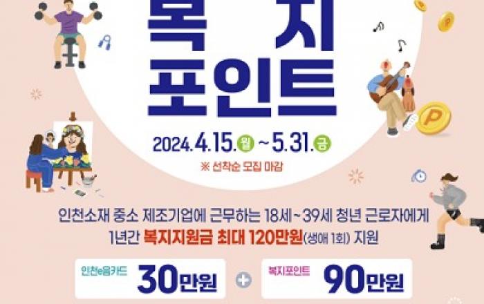 청년들의 장기 재직 근속 유도를 위한 ‘인천 재직청년 복지포인트 사업’ 참여자를 오는 4월 15일(월)부터 5월 31일(금)까지 선착순 모집한다고 밝혔다. 인천형 청년 근로장려 인센티브 지원의 일환인 이번 사업은 조기 퇴사의 주요 요인인 복리후생 불만요인을 해소하기 위