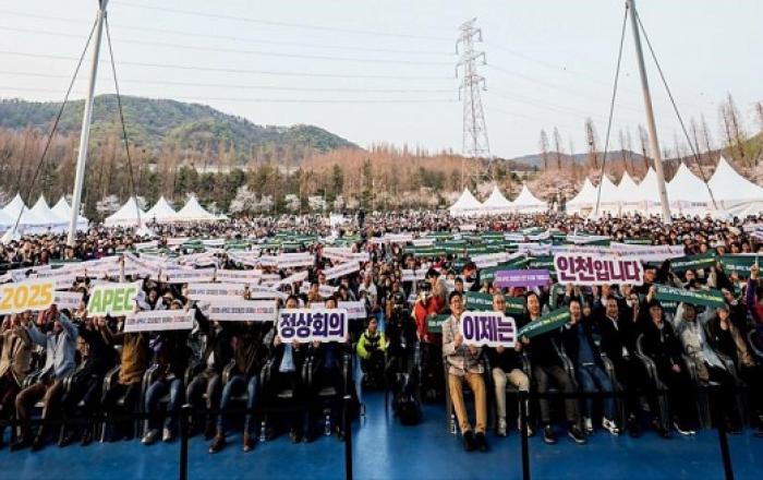 ▲2025 APEC 유치 퍼포먼스[인천시제공]인천대공원사업소는 2025 아시아태평양경제협력체(APEC) 정상회의 인천 유치를 기원하며 지난 6일부터 7일까지 이틀간 개최한 ‘인천대공원 범시민 벚꽃축제’를 성황리에 마쳤다고 밝혔다. 벚꽃이 예상보다 늦게 개화를 시작해 행