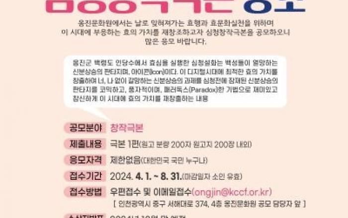 옹진문화원(원장 태동철)은 날로 잊혀져가는 효행과 효문화 실천을 위해 시대에 부응하는 효의 가치를 재창조하고자 오는 8월 31일까지‘심청창작 극본’을 공모한다고 밝혔다.이번 공모전은 디지털 시대 효의 가치를 다시 돌아보고 효의 미덕을 계승 발전시켜 시대변화에 선구적 향