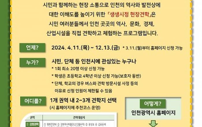 인천 곳곳의 주요 현장 및 시설을 직접 견학하고 체험 하는 ‘생생시정 현장견학’을 오는 4월 11일부터 12월 13일까지 시행한다고 밝혔다.인천개항장, G타워 등을 비롯한 인천 주요 역사, 문화, 교육 시설들을 시민 누구나 직접 방문해 견학할 수 있다. 올해 견학 프로