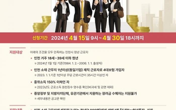인천광역시는 청년들이 안정적으로 미래를 계획하고 목돈을 마련할 수 있는 드림포(For)청년통장 지원사업 참여자를 4월 15일부터 4월 30일까지 모집한다고 밝혔다.드림포(For)청년통장은 청년 근로자가 매월 15만 원씩 3년간 총 540만 원을 저축하면 만기 시 인천시