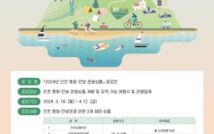 인천광역시와 인천관광공사는 새로운 여행수요 창출과 평화관광 가치 확산을 위한 ‘인천 평화ㆍ안보 관광상품 공모전’을 3월 18일(월)부터 4월 12일까지 개최한다. 이번 공모전은 인천의 평화·안보 관광자원을 활용한 3개 권역(인천상륙작전·강화권·옹진권)의 테마 상품개발을