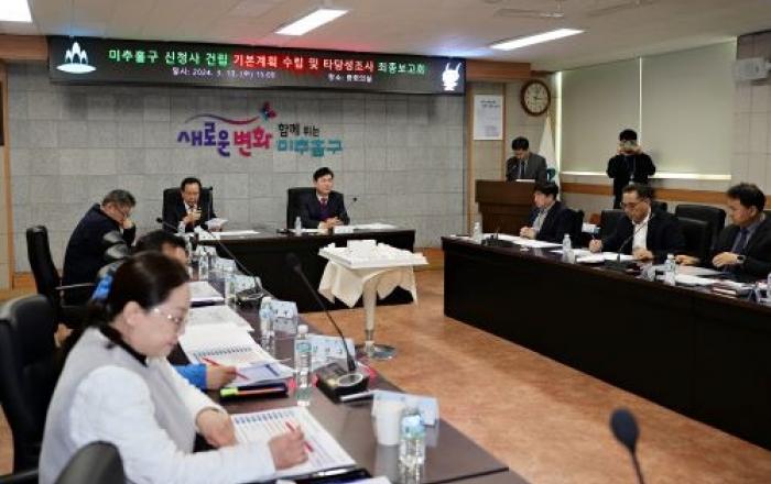 인천 미추홀구 이영훈 구청장은 지난 13일 신청사 건립의 합리적 방법을 모색하고 최적의 건립 계획을 찾기 위해 최종보고회를 개최했다.이번 최종보고회에서 구는 중간 보고회에서 논의됐던 사항과 행정안전부 타당성 조사 기관인 지방재정투자분석센터의 조사 결과 반영 여부 등을