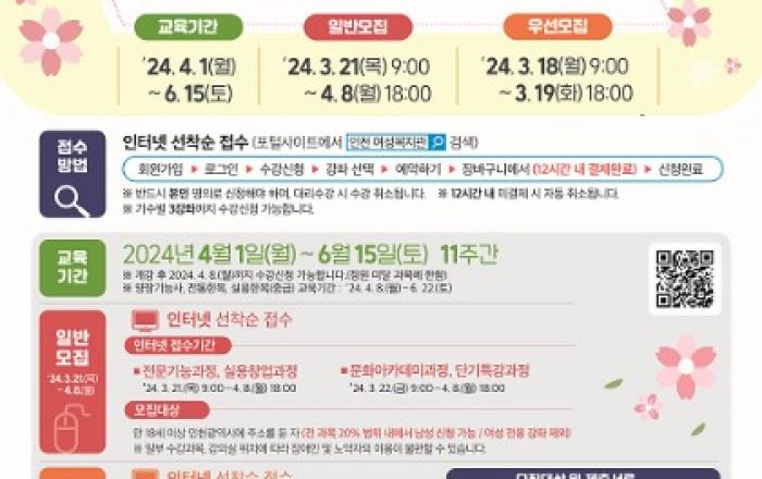 인천광역시 여성복지관이 2024년도 제2기 사회교육강좌 수강생을 모집한다고 밝혔다.교육기간은 4월 1일부터 6월 15일(양장기능사·전통한복·실용한복(중급) 교육기간은 4월 8일부터 6월 22일)까지로 전문기능과정, 실용·창업과정, 문화아카데미과정 등 85개 강좌에 1,