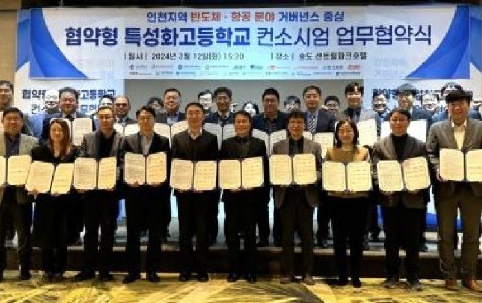 [사진제공=인천시교육청]지역 거버넌스 중심 ‘협약형 특성화고등학교’ 지정을 위한 반도체 및 항공 분야 컨소시엄을 구성하고 업무협약을 12일 체결했다. 협약식에는 인천시교육청과 인천시청을 비롯해 반도체 및 항공 분야 컨소시엄 참여기관인 산업체, 지역대학, 관계기관 등 2
