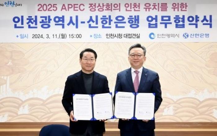 [사진제공=인천시]인천광역시와 신한은행은 11일 시청 접견실에서 2025년 우리나라에서 개최하는 아시아‧태평양경제협력체(이하 APEC) 정상회의의 인천유치를 위한 업무협약(MOU)을 체결했다고 밝혔다.협약식에는 유정복 인천시장과 정상혁 신한은행장이 직접 참석해 업무협약