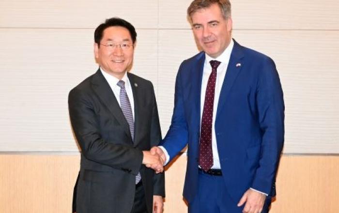 ▲덴마크 기후에너지유틸리티부 장관 면담[사진제공=인천시]인천광역시 유정복 시장은 6일 여의도 전경련회관에서 라스 아가드(Lars Aagaard) 덴마크 기후에너지유틸리티부 장관과 페어 마이너 크리스텐센 (Per Mejnert Kristensen) 오스테드 아시아·태평양