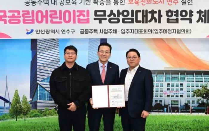 인천 연수구는 지난 4일 구청 소회의실에서 신규 준공 예정 공동주택 사업주체와 국공립어린이집 무상임대차 협약을 체결했다. 이번 협약은 3월 준공 예정인 ‘연수서해그랑블에듀파크’ 공동주택 내 국공립어린이집을 설치·운영하기 위해 마련됐으며, 주민공동시설인 어린이집 건물을