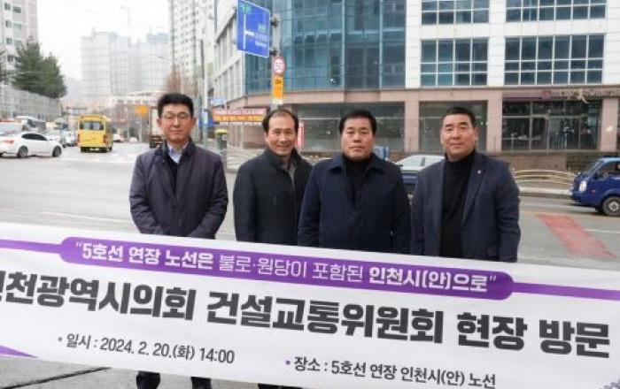 인천시의회 건설교통위원회는 20일 임관만(국·중구1) 위원장과 서구가 지역구인 김명주(민·서구1) 의원 등이 서구 원당동에 소재한 인천도시공사 검단사업단 홍보관을 방문해 서울 5호선 검단·김포 연장 노선에 대한 사업추진 상황을 청취하고, 인천시 노선안 반영 등 다양한