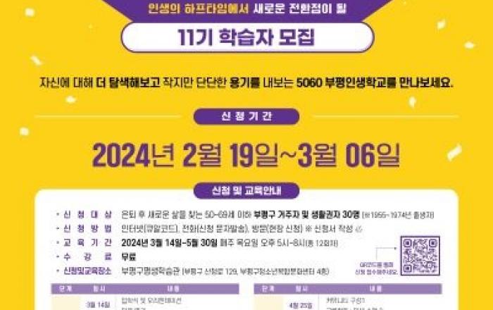 부평구가 오는 19일부터 다음 달 6일까지 ‘5060 부평인생학교’ 11기 수강생을 모집한다.5060 부평인생학교는 인생 후반기를 준비하는 중‧장년층을 위해 특화된 맞춤형 평생교육 프로그램이다. 교육 대상은 50세~69세(1955년~1974년 출생자)이며, 참여를 희망