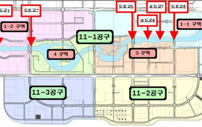 인천경제자유구역청은 송도 11-1공구의 유수지 친수공간 교량 부분에 대한 경관조명 사업을 내달 착공한다고 7일 밝혔다. 인천경제청은 송도 11-1공구의 교량 총 20곳 가운데 1단계로 22억원의 사업비를 들여 1단계인 1-1·1-2 구역의 교량 7개소를 먼저 발주하고