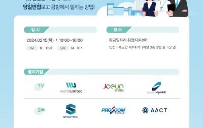 중구는 오는 15일 운서동 소재 항공일자리 취업지원센터(인천국제공항 제1여객터미널 4층)에서 2024년도‘제1회 공항 일자리 채용의 날’ 행사를 개최한다고 밝혔다. 이번 ‘공항 일자리 채용의 날’은 항공산업 분야 일자리 확대와 관련 기업의 인력수급 문제 해결을 위해 마