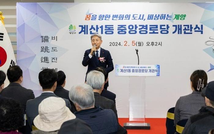 인천광역시 계양구가 지난 5일 계산1동중앙경로당 개관식을 개최했다.이날 개관식은 윤환 계양구청장을 비롯해 조양희 계양구의회 의장, 김대기 대한노인회 계양구지회장, 계산1동중앙경로당 회장과 지역주민 등이 참석한 가운데 그간 사업 경과보고, 기념사·축사, 현판식, 테이프
