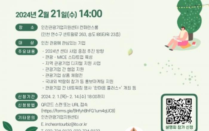 인천광역시와 인천관광공사는 오는 2월 21일 오후 2시 인천관광기업지원센터 컨퍼런스룸에서 2024년 센터 지원사업에 대한 설명회를 개최한다고 밝혔다.금번 설명회는 2024년 센터 지원사업의 추진방향과 사업별 상세한 정보제공을 통해, 관광기업들이 필요한 지원사업을 효과적