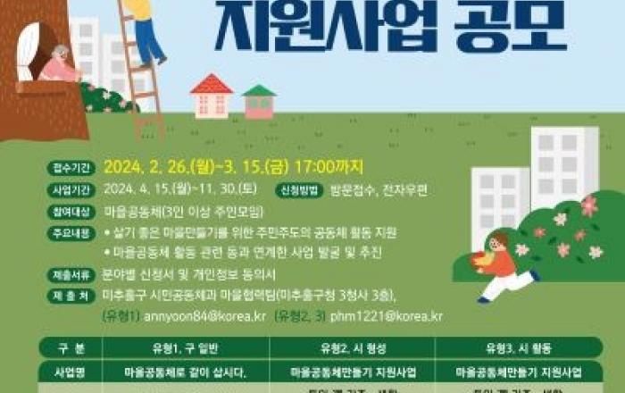 인천 미추홀구는 2일 주민주도의 살기 좋은 마을 조성을 위한‘2024년 마을공동체 지원사업’에 참여할 공동체를 모집한다고 밝혔다.접수 기간은 오는 26일부터 3월 15일까지로 같은 동에 거주하는 주민 3인 이상을 1개의 공동체로 구성해 구청 시민공동체과로 방문 접수하거