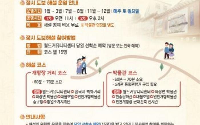 인천시 중구청은 올해 2월 3일부터 매주 주말 개항장 일대를 방문한 관광객들을 대상으로 ‘정시 도보 해설’을 운영한다고 밝혔다. 개항장 도보 해설은 역사문화해설사의 재미있고 유익한 설명을 들으며, 140여 년의 근대 문화·역사가 서린 ‘1883 제물포 개항장’ 권역을