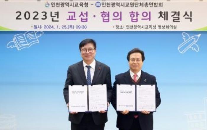 도성훈 교육감은 시교육청 영상회의실에서 인천광역시교원단체총연합회(회장 이대형)와 2023년 교섭·협의 합의 체결식을 25일 개최했다. 체결식에는 도성훈 교육감과 이대형 회장을 비롯해 총 9명의 교섭위원이 참석했다.이번 교섭·협의는 인천교총의 144개 항목에 대한 요구에