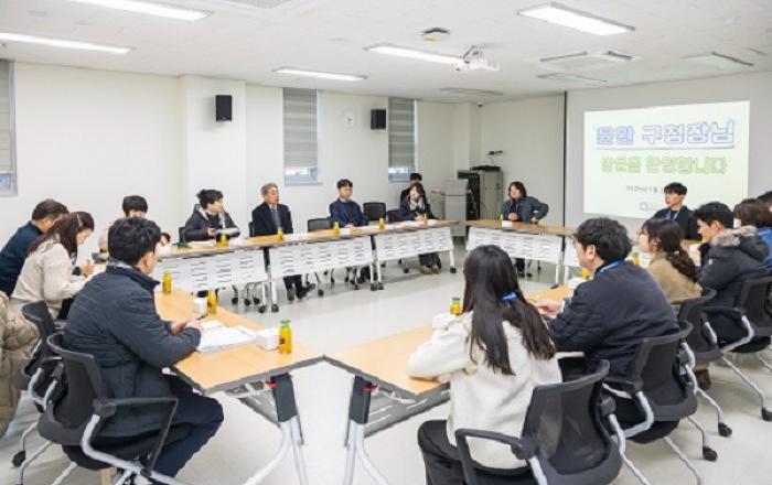 인천 윤환 계양구청장이 새해를 맞아 지난 23일 복지·교육·문화·체육시설 등을 찾아 현장에서 기관 운영의 애로사항과 건의사항 등을 청취하고 있다. 23일 윤환 구청장은 계양구청소년수련관을 시작으로 ▲계양구학교밖청소년지원센터 ▲계양청소년문화의집 ▲계양구청소년상담복지센터를