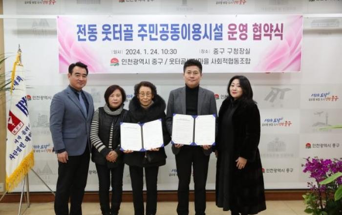 인천 중구와 웃터골샘터마을 사회적협동조합은 24일 오전 중구청 구청장실에서 이 같은 내용의 ‘전동 웃터골 주민공동이용시실 운영 협약’을 체결했다. 주민공동이용시설은 ‘전동 웃터골 저층 주거지 재생사업’의 일환으로 주민들이 다양한 활동을 펼치며 소통·협력하고 자립할 수