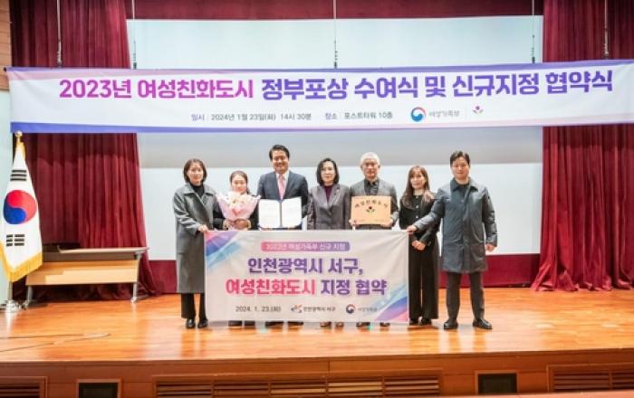 인천 서구는 2023년 여성친화도시로 신규 지정된 가운데 지난 23일 서울 명동에 위치한 포스트타워 대회의실에서 여성가족부와 여성친화도시 신규 지정 협약을 체결했다고 밝혔다. 이날 협약식에는 김현숙 여성가족부 장관을 비롯해 정부포상 3개, 신규지정 15개 지자체가