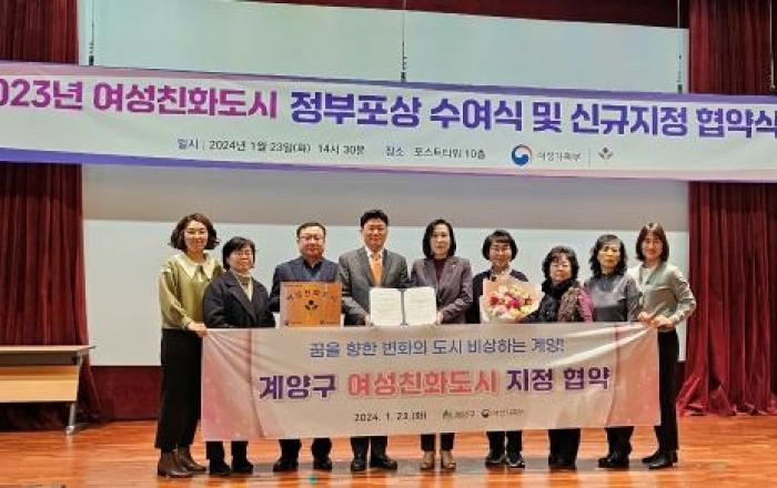 인천광역시 계양구가 23일 서울 포스트타워에서 여성가족부와 여성친화도시 신규 지정 협약을 체결했다.‘여성친화도시’는 지역 정책 수립과 집행 과정에서 여성과 남성의 균형 있는 참여를 비롯해 여성의 역량 강화, 돌봄지원 확대, 안전한 도시환경 조성을 추진하는 도시를 의미한