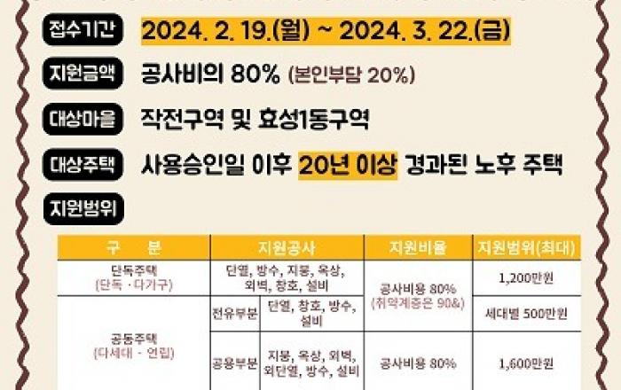 인천시 계양구 윤환 구청장은 인천형 저층주거지 재생사업의 만족도 제고와 자발적 주택 개량 유도를 위해 2024년도 저층주거지 집수리 지원사업을 추진한다고 22일 밝혔다.인천형 저층주거지 집수리 지원사업은 주민의 복리증진에 기여하고 쾌적한 환경을 조성하기 위해 사용승인일