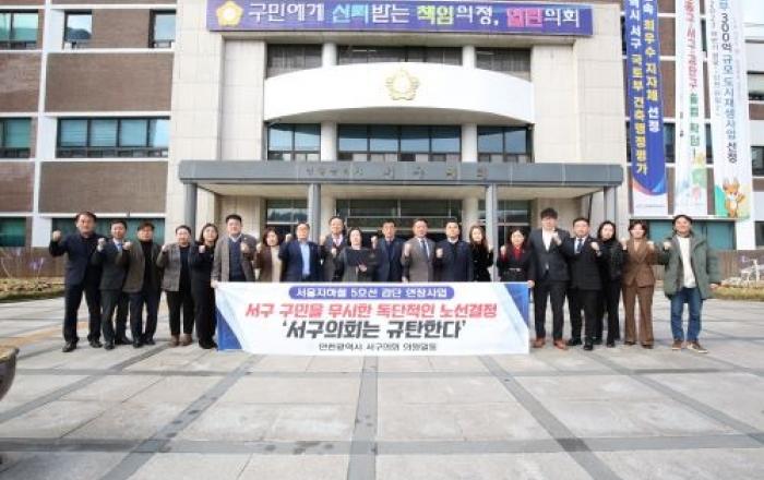 인천 서구의회가 22일 지난 19일 발표된 대도시권 광역 교통위원회의 ‘서울지하철 5호선 검단 연장사업’의 노선 조정안을 규탄하기 위한 결의에 나섰다. 고선의 의장은 결의문 낭독을 통해 “검단 주민들의 교통소외를 더 이상 외면해서는 안되며, 반드시 원당역과 불로역을 노