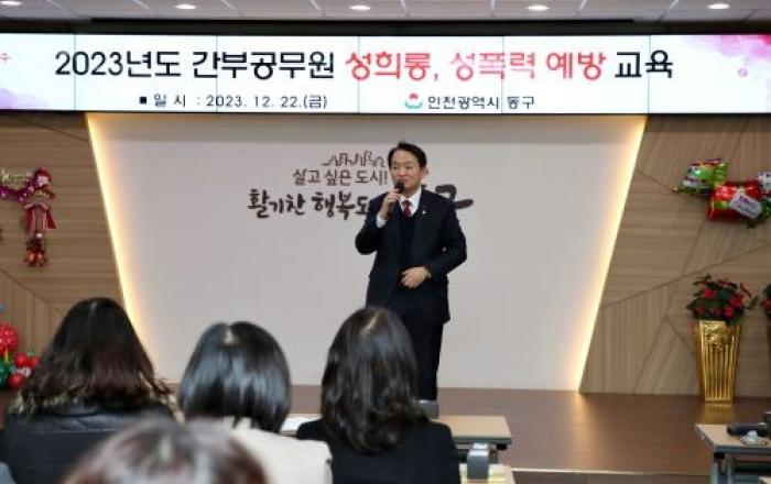 인천 동구는 최근 구청 소나무홀에서 5급 이상 간부 공무원을 대상으로 성폭력·성희롱 예방교육을 실시했다고 밝혔다.이번 교육은 건강한 공직문화를 조성하고 공무원들의 성인식 개선을 위하여 마련됐다. 간부들의 성인지 감수성을 높이고 경각심을 일깨우는 데 중점을 뒀다. 교육을