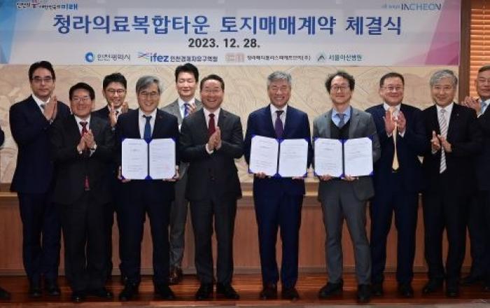 [사진제공=인천경제청]인천경제자유구역청은 28일 인천시청에서 청라의료복합타운의 사업법인인 청라메디폴리스피에프브이(주), 서울아산병원과 토지매매계약을 체결했다고 밝혔다. 이날 체결식에는 유정복 인천시장, 김진용 인천경제청장, 박승일 서울아산병원장, 사업법인의 주주사인 케