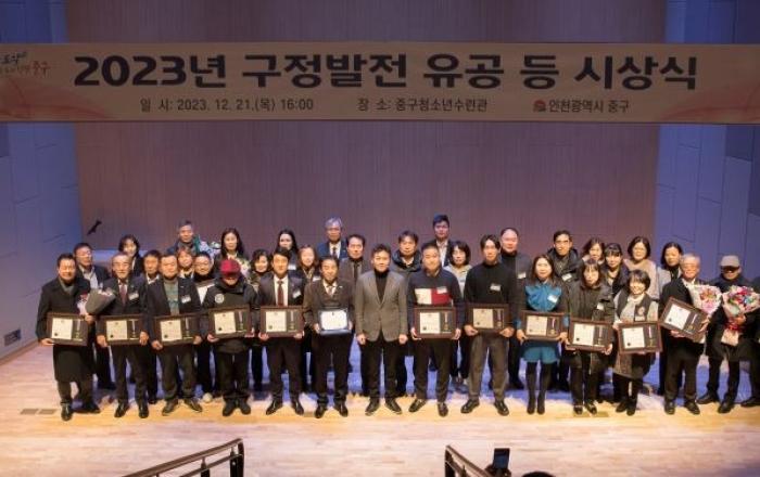 [사진제공=중구청]인천시 중구 김정헌 구청장은 지난 21일과 22일 각각 영종 중구청소년수련관과 원도심 한중문화관에서 ‘2023년도 구정 발전 유공 등 시상식’을 개최했다고 밝혔다. 이번에 표창장과 감사패를 받은 이는 ▲구정 발전 유공 38명, ▲주민자치 활성화 유공