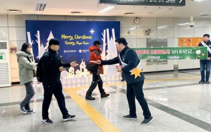 [사진제공=인천교통공사]인천교통공사는 지난 21일 연말을 맞이해 핫팩 나눔 행사를 실시했다고 밝혔다.이날 행사는 연말을 맞아 고객들에게 따뜻한 마음을 전달하고자 진행됐으며, 검암역 등 10개 역에서 핫팩 2,000매를 고객들에게 나눠 줬다.또한, 검암역, 가정역, 인천