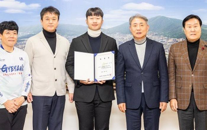 [사진제공=계양구]인천 윤환 계양구청장은 지난 21일 계양구청 소회의실에서 계양구청 양궁선수단에 입단한 컴파운드 종목 박승현 선수에게 임용장을 수여하고 선수단을 격려했다. 박승현 선수는 한국체육대학 졸업 예정자로, 2022년부터 2023년까지 국가대표로 선발