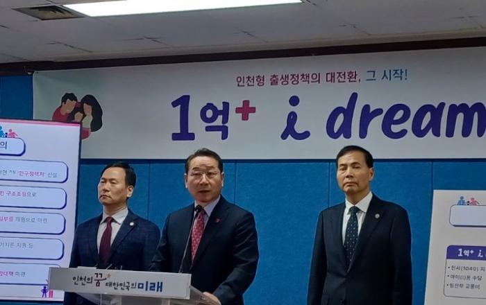 유정복 인천광역시장은 12월 18일 국가 재앙수준의 저출생 심각성을 인식하고 인천에서 태어나면 누구에게나 1억 원을 지원하는 ‘1억 플러스 아이드림(1억+i dream)’을 발표했다.우리나라 정부는 2006년부터 올해까지 380조에 달하는 천문학적인 예산을 투입하여 저