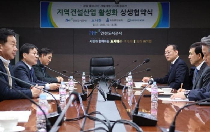 [사진제공=인천도시공사]인천도시공사는 ‘검암 플라시아 개발사업 단지조성공사’의 시공사와 지역건설산업 활성화 상생협약을 체결하였다고 14일 밝혔다.이번 협약식에서 iH는 시공사인 ㈜서한, 화주종합건설(주), 대한전문건설협회 인천광역시회와 함께 지역업체의 참여율 제고를 위